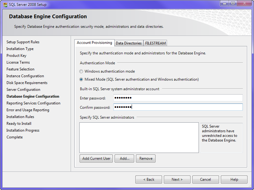 Step 16 : Select Mixed Mode --> enter in any password --> and specify SQL server admins.
